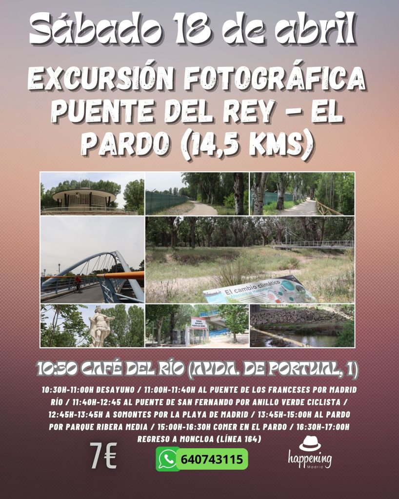 La excursión que haremos nos llevará desde el mismo corazón de Madrid frente al Palacio Real y al Puente del Rey hasta la Plaza del Pardo siguiendo la ribera del Manzanares. Es una excursión de 14,5 kms que haremos yendo despacio y disfrutando del paisaje en unas 4 horas.