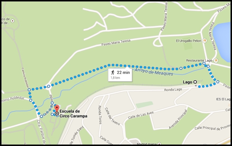 La escuela de circo Carampa se encuentra en la Casa de Campo junto al Albergue Juvenil Richard Schirrmann en el Camino del Robledad 9. Está equidistante de las estaciones de Metro de El Lago y de Batán a un paseo de de veinte minutos.
