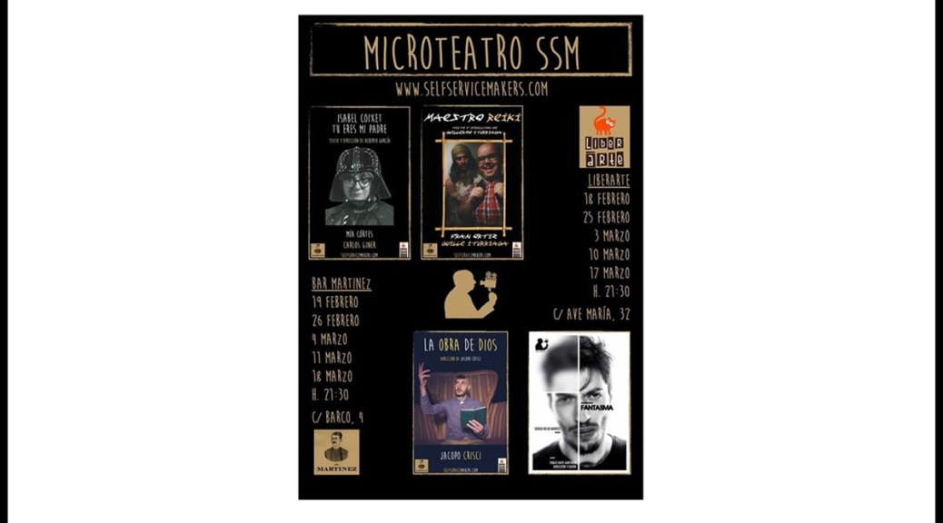Este próximo Jueves, 18 de Febrero de 2016, desde Happening Madrid os proponemos ir a ver la propuesta de microteatro que tenemos de la mano de Self Services Makers. Serán cuatro obras de pequeño formato y música en directo. La aportación es de 5 Euros.