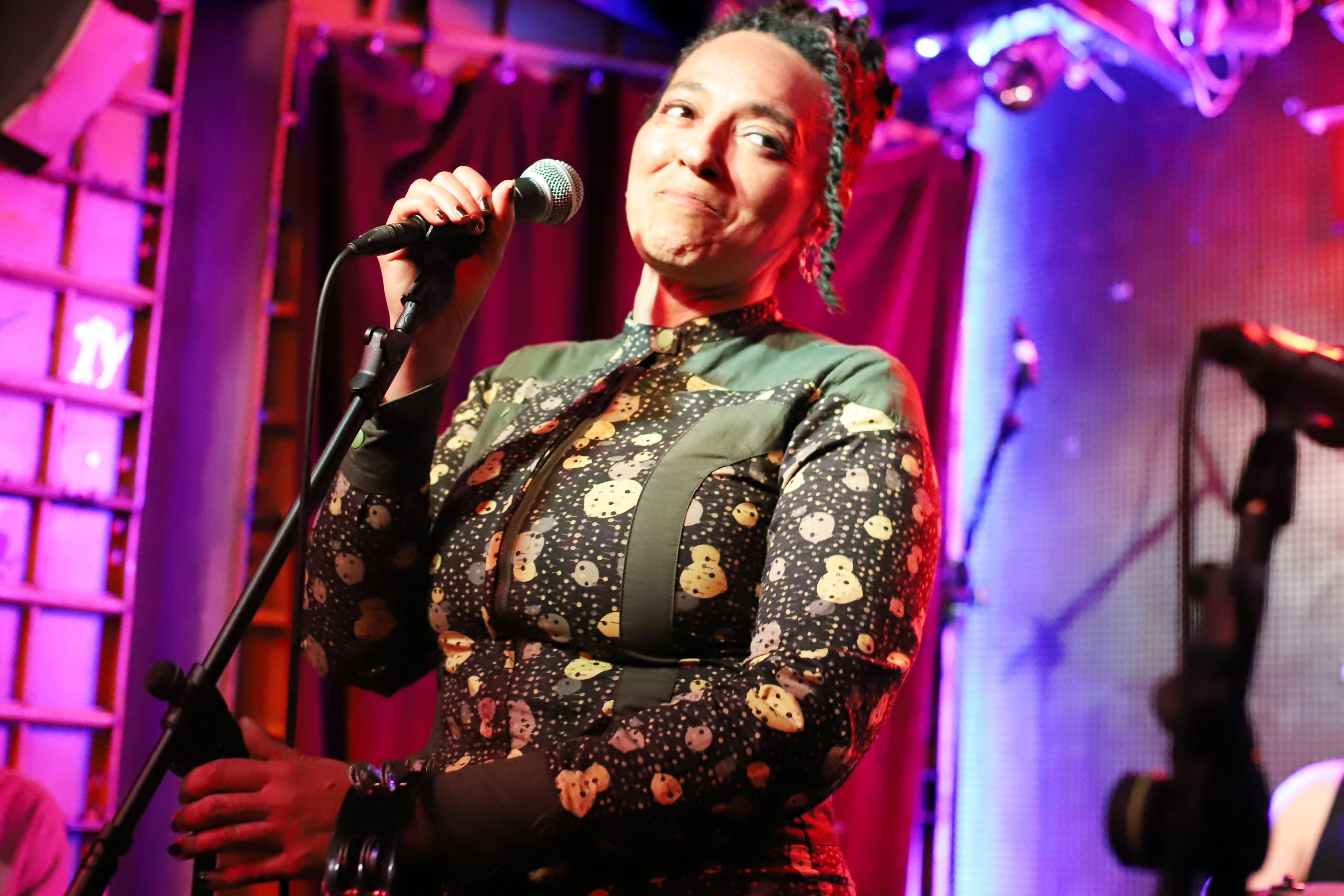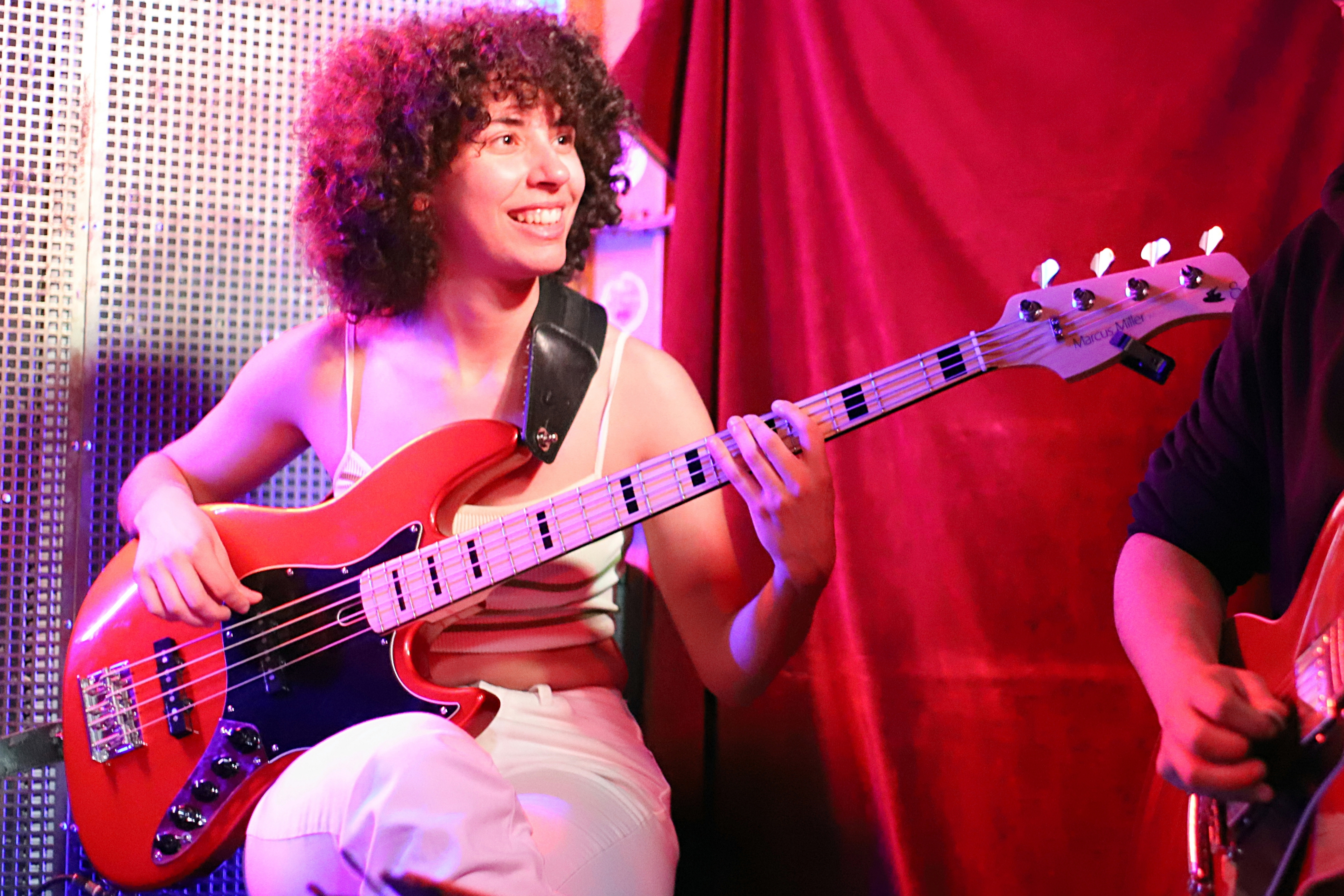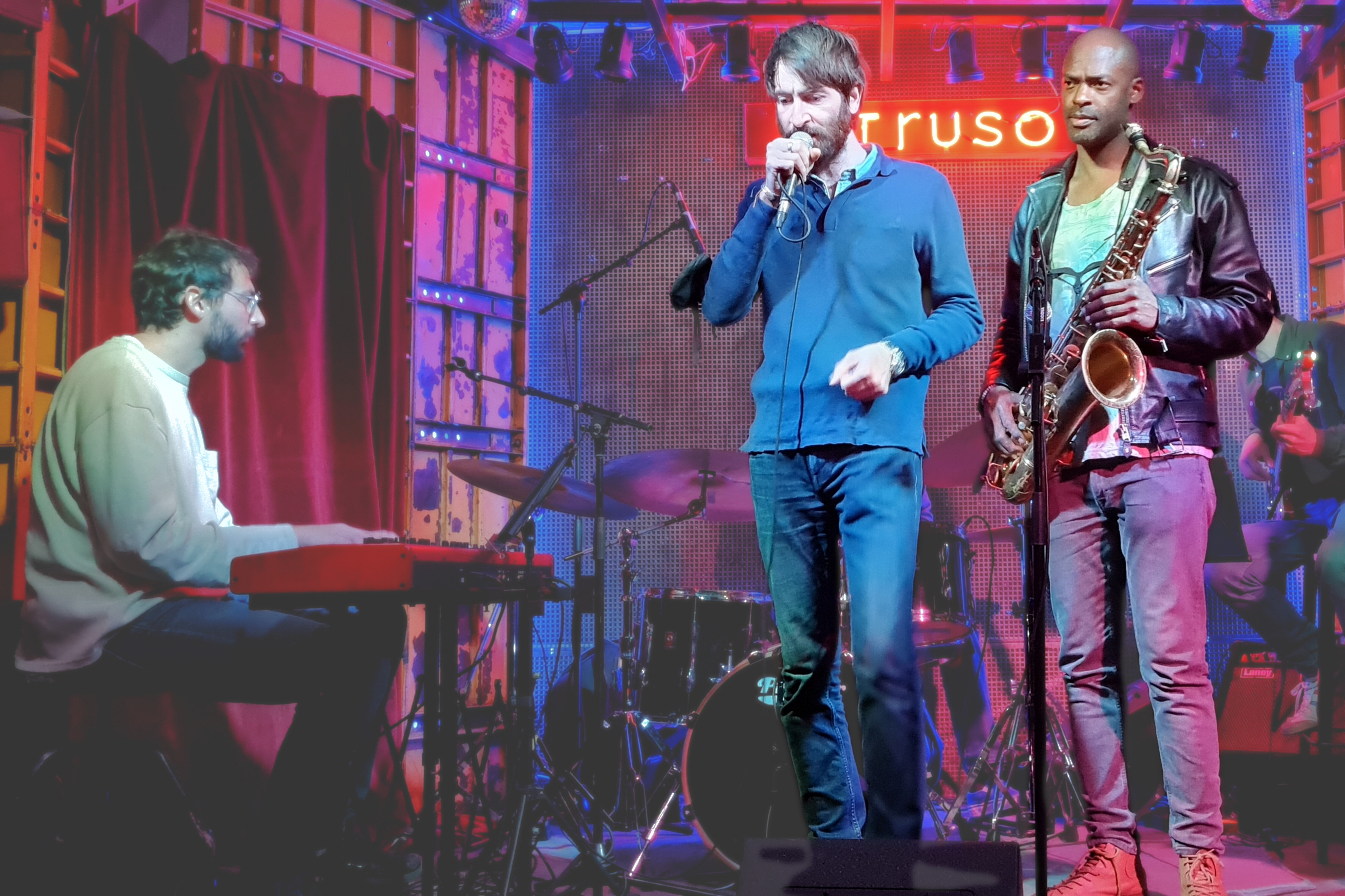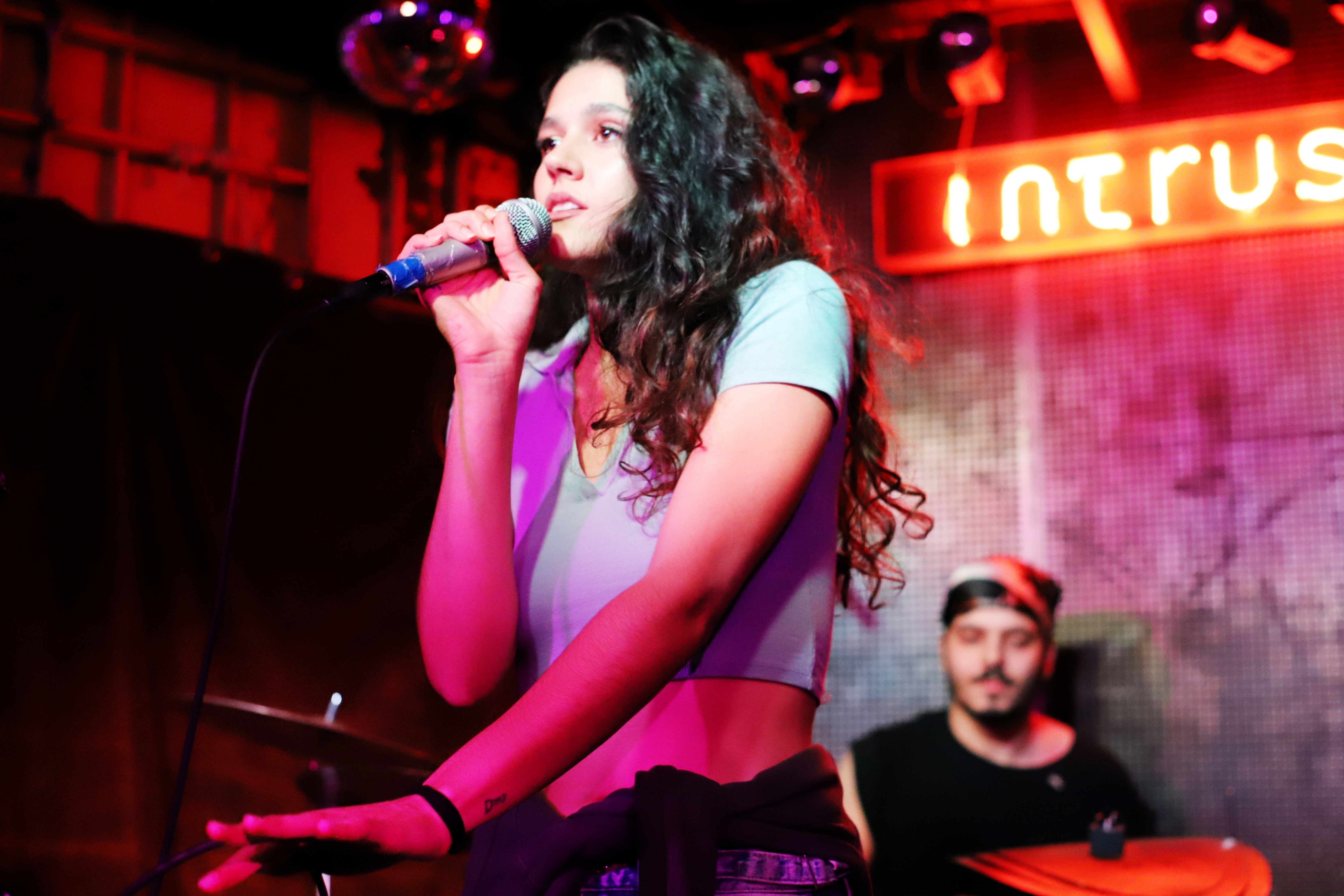 Un boa de plumas rojo recorre el pie de micro y cae hasta el suelo, aportando una nota de color intenso que guía la mirada hacia el centro de la escena. El fondo muestra paneles acústicos, amplificadores y parte de la batería y un violín apoyado, elementos que sitúan la actuación en una pequeña sala de rock como el espacio de conciertos de Madreams Music.