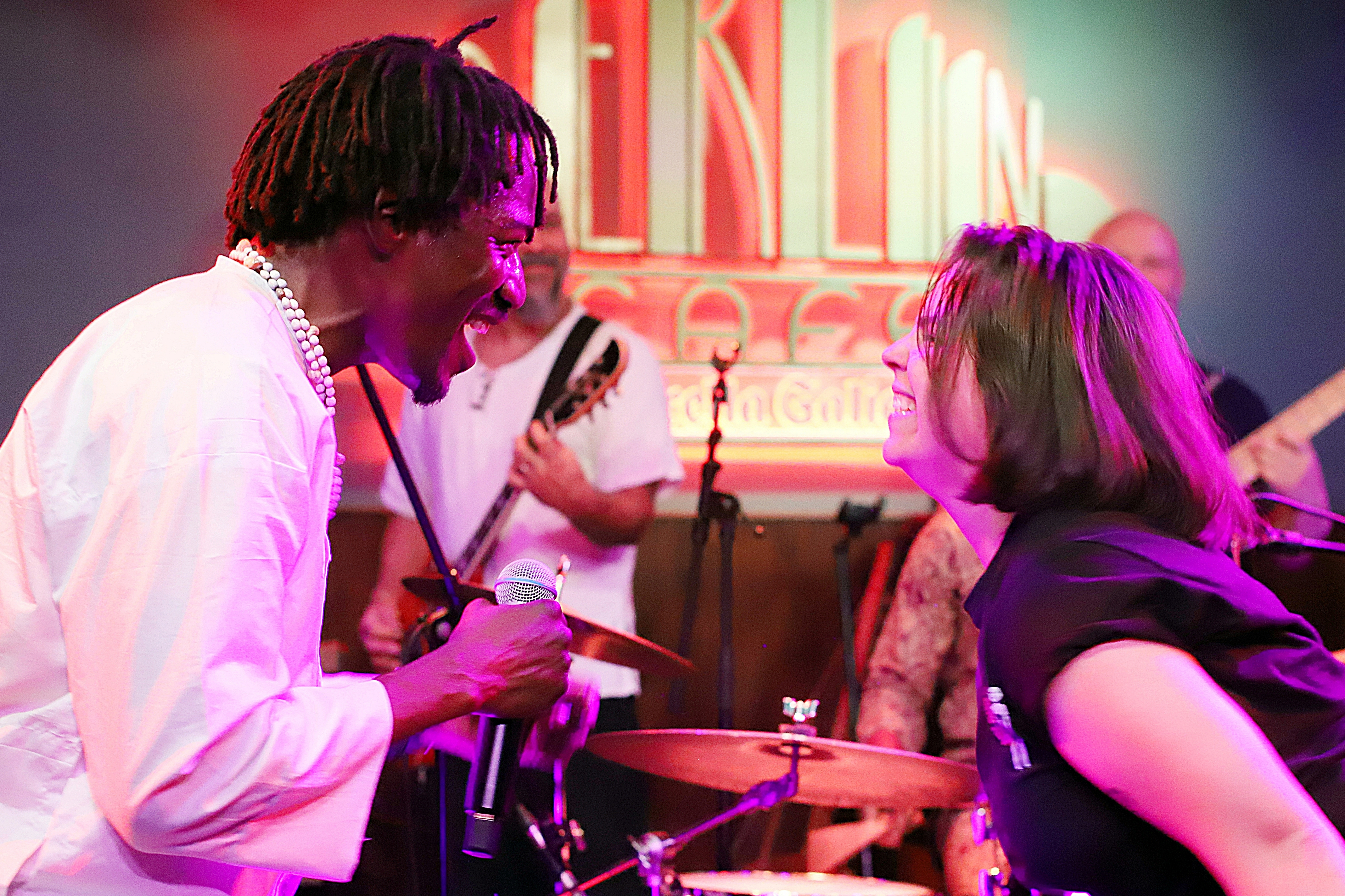 14. 04-0013 Ogun Afrobeat en el Café Berlín. 13 de Febrero de 2025. Akin baila con una espectadora.