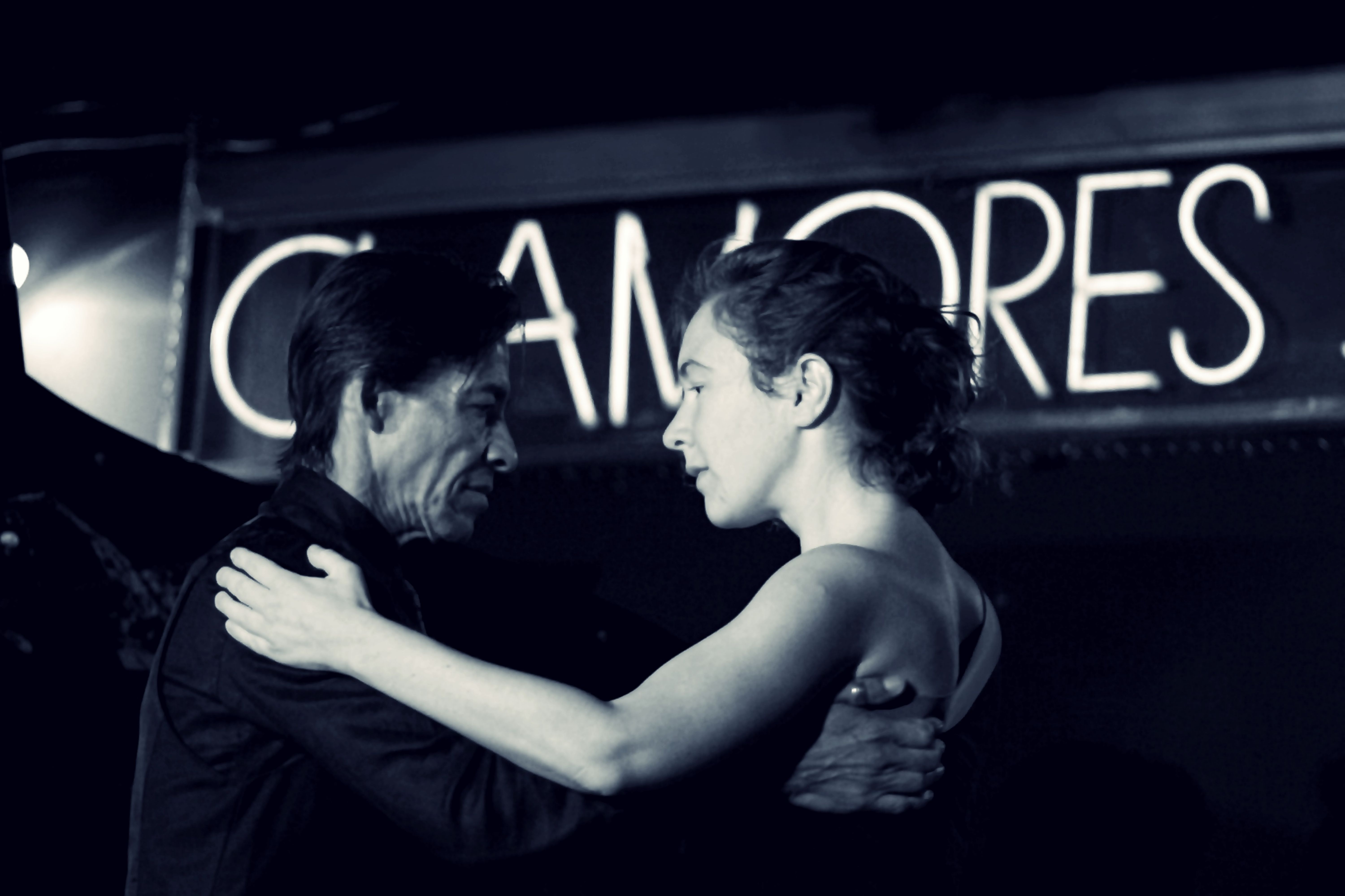 La fotografía, en blanco y negro, encuadra a la pareja de espaldas al público, abrazada en posición de gafieira: él con chaqueta oscura, ella con vestido de tirantes, apoyada en su brazo y con el cabello recogido. Sus cuerpos forman una silueta compacta y contenida, mientras el gesto de sus manos sugiere un movimiento suave, casi suspendido, que acompasa el ritmo del escenario. Al fondo, ligeramente desenfocada, destaca la luminosa rotulación de “CLAMORES”, que identifica la histórica sala madrileña y sitúa la escena en un templo clave del jazz y las músicas del mundo en la ciudad.