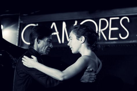 La imagen muestra a Carlos Martini y Milliana bailando samba de gafieira en la Sala Clamores durante el concierto de Sandra Carrasco y José María Cortina del 24 de septiembre de 2016, en un abrazo cerrado y elegante