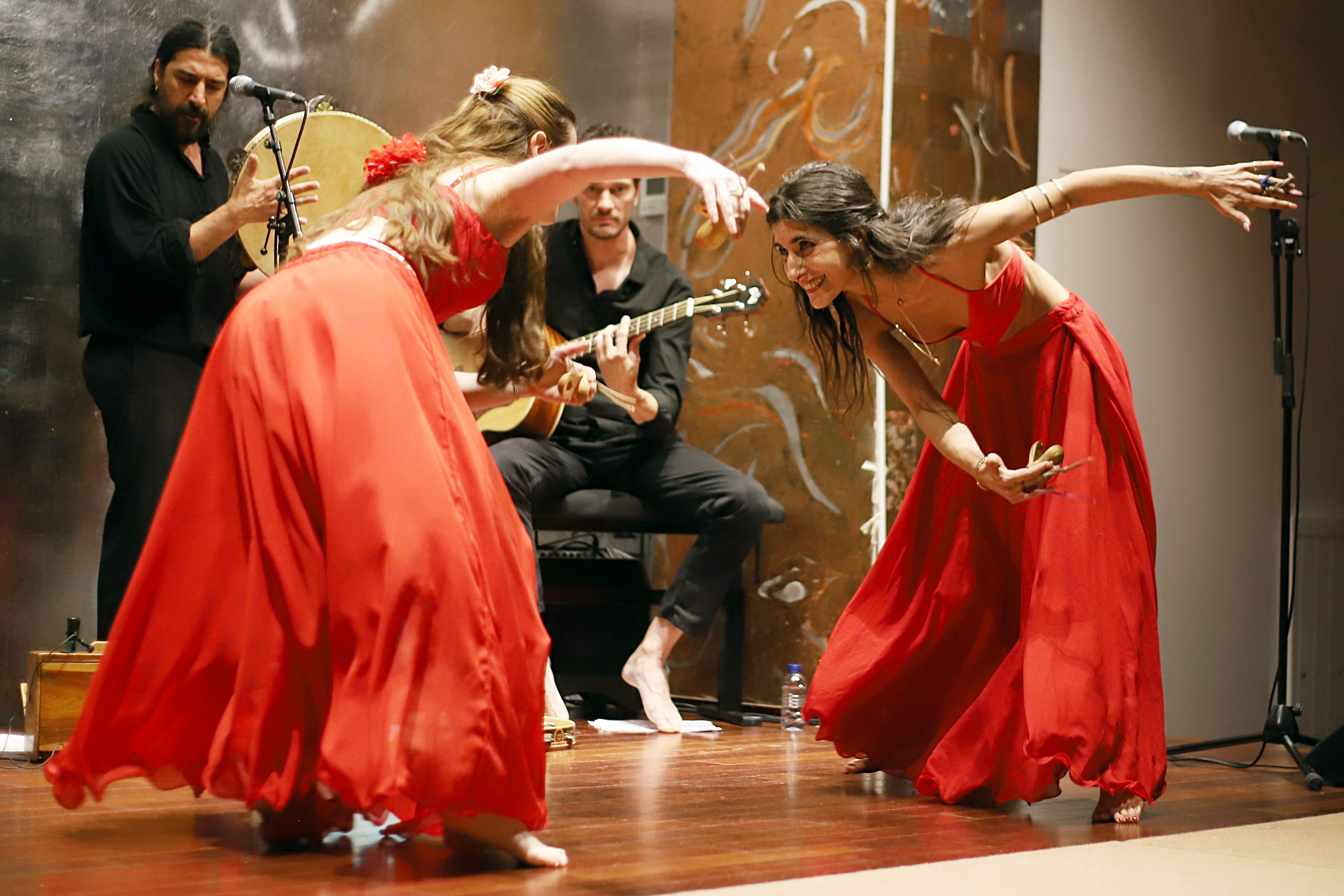 La foto recoge un momento de danza descalza sobre el escenario durante el concierto especial de la jam de bossa nova Leva‑me Para Lua en la sala El Umbral de Primavera, el 3 de junio de 2015.