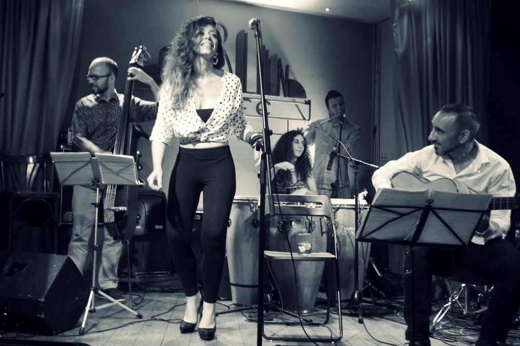 La imagen muestra a la banda brasileña Só danço samba actuando en Madreams Music el 13 de noviembre de 2021, en formato acústico e íntimo, con la flautista Leticia Malvares al frente del escenario.