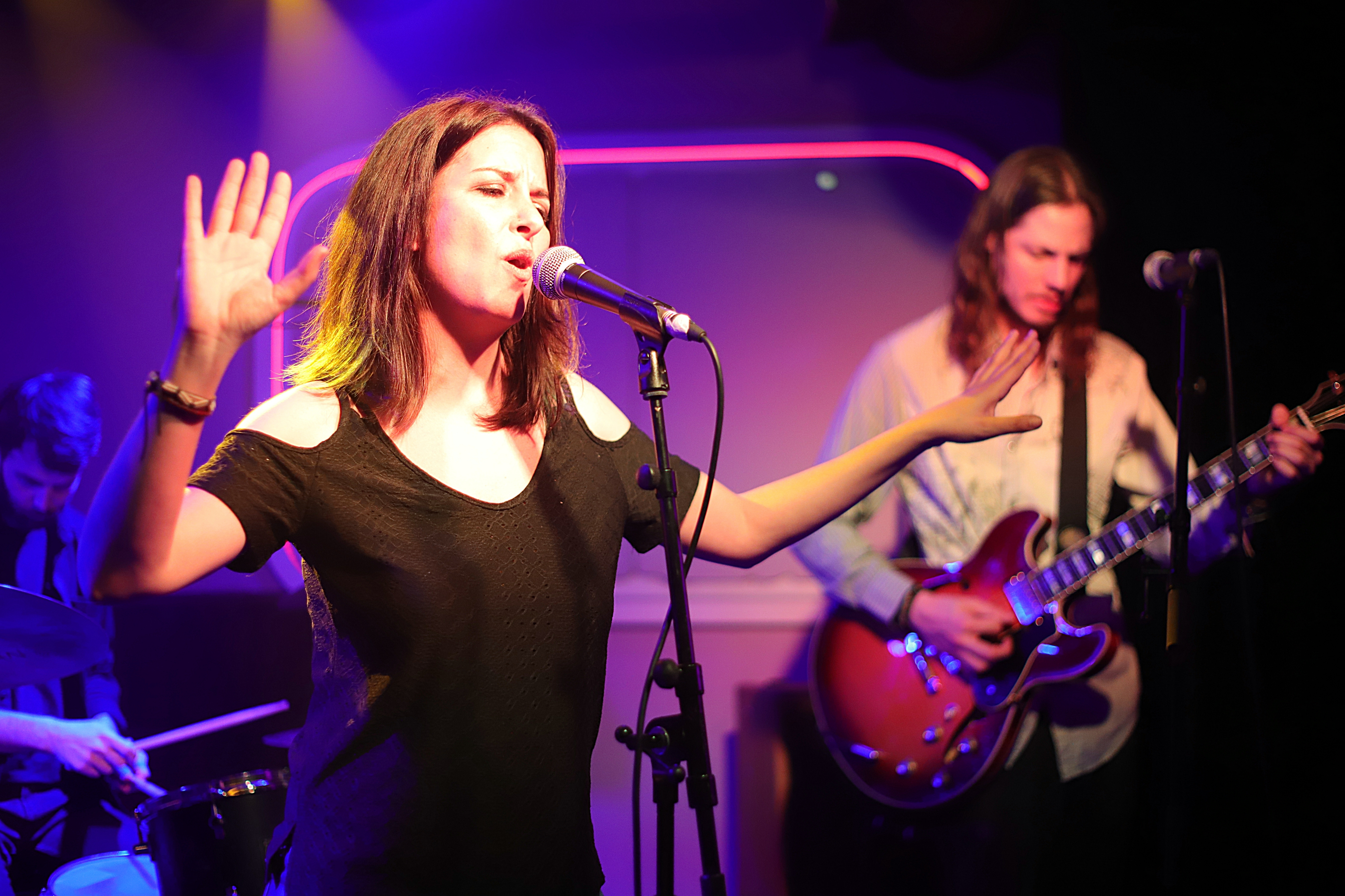 La imagen muestra a la compositora, violinista y cantante Montxika Baut en pleno concierto en Madreams Music, el 2 de noviembre de 2018, en un escenario íntimo y  rockero con guitarra eléctrica‑acústica roja y un llamativo boa de plumas sobre el pie de micro.