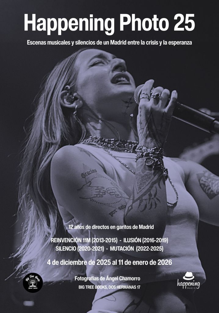 Happening Photo 25 podrá visitarse en Big Tree Books (C/ Dos Hermanas, 17 – Lavapiés) desde el 4 de diciembre de 2025 hasta el 11 de enero de 2026, con entrada libre durante el horario habitual del espacio.