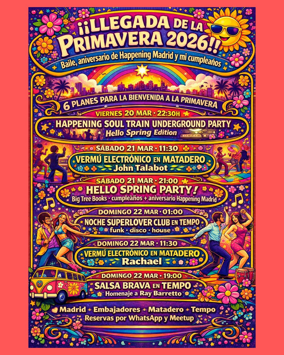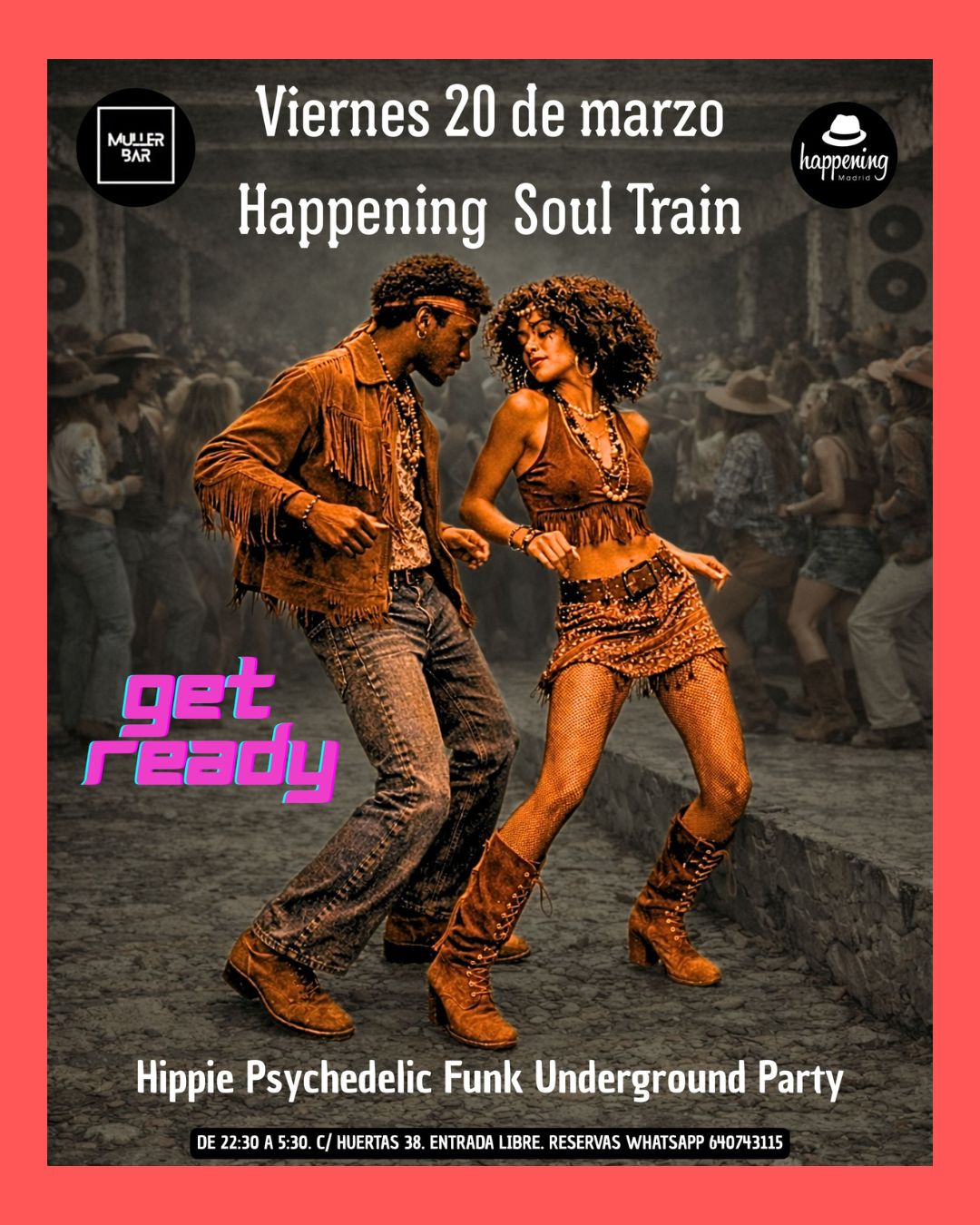 Abrimos la puerta del fin de semana con una fiesta en la que la pista manda y el espíritu es 100% retro. Happening Soul Train Underground Party – Hello Spring Edition es nuestra forma de convertir Madrid en un episodio de Soul Train: funk y disco 70–80s a todo trapo, con alma analógica y actitud de pista de baile infinita.