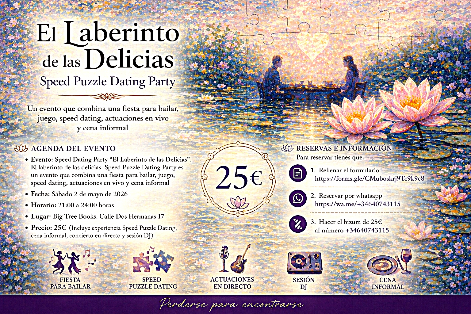 • Precio: 25€ (Incluye experiencia Speed Puzzle Dating, cena informal, concierto en directo y sesión DJ)