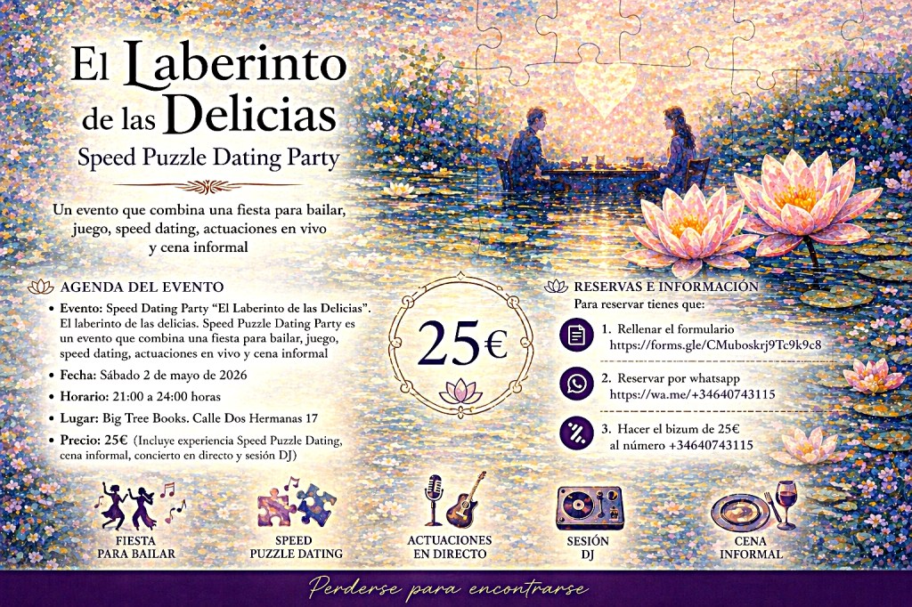 Olvida las apps de citas y las entrevistas a contrarreloj. El próximo 2 de mayo, el mítico espacio Big Tree Books se transforma en un jardín inmersivo que fusiona juego, cena y actuaciones en vivo, la única regla será dejarte llevar para encontrar tu pieza en el rompecabezas. ¿Encajarás?