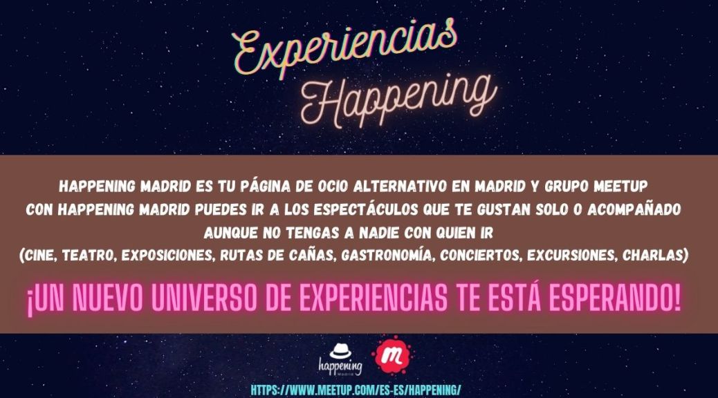 Happening Madrid es un club de ocio alternativo que ofrece encuentros culturales y divertidos para salir en Madrid: Conciertos, cine de culto y documental, paseos o excursiones fotográficas, rutas gastronómicas y planes originales/distintos.