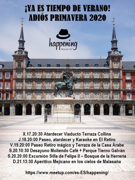 Esta es la última semana de la primavera y el sábado damos la bienvenida al verano. La maldita pandemia nos ha robado gran parte de ella pero estos próximos meses vamos a vivir al 200%. No os vamos a hablar del coñazo de la cacareada nueva normalidad, no os vamos a desescalar nada, aún menos nos vamos a detener en esa endemoniada distancia social, para hablar de eso ya tenemos la tele, la radio, los periódicos y las redes sociales. En Happening Madrid solo se nos ocurre hablaros de una cosa: PASARLO DE MIEDO SIN MIEDO Y ASUMIR CON ALEGRÍA LO QUE NOS TOCA VIVIR. Consideramos un acto de solidaridad repartir alegría con responsabilidad. Nuestra misión es que todos seamos algo más felices y si algo sabemos es hacer cumplir nuestra misión. También tenemos una visión: Conciertos, música, gastronomía, cine y mucha cultura y diversión para todos. ¡Ya nos inventaremos como hacerlo! ¡Madrid y nuestra imaginación son nuestros grandes aliados!
