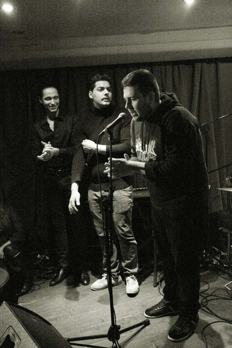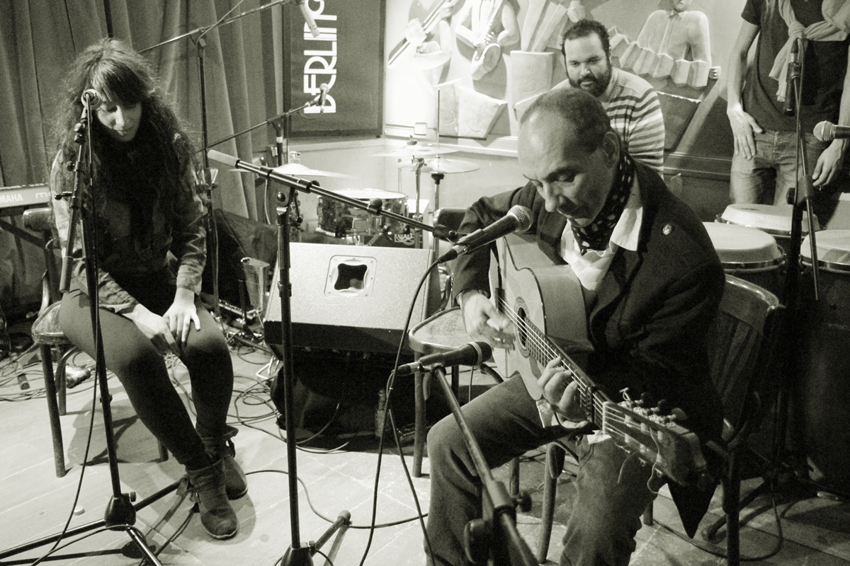 El Café Berlinse llena hasta la bandera. Todo aquello que pueda ser susceptible de ser usado para sentarse se usa: se comienza por los asientos y las mesas, se sigue por el suelo y se acaba por los soportes de los monitores y la tarima del escenario. Acaba siendo un todo continuo de aficionados, músicos, cantaores que te hace sentirte parte de aquel momento especial de creación de algo único que sabes que va a suceder. Lejos de sentirte extraño te sientes parte de esa fusión y disfrutas con ello.
