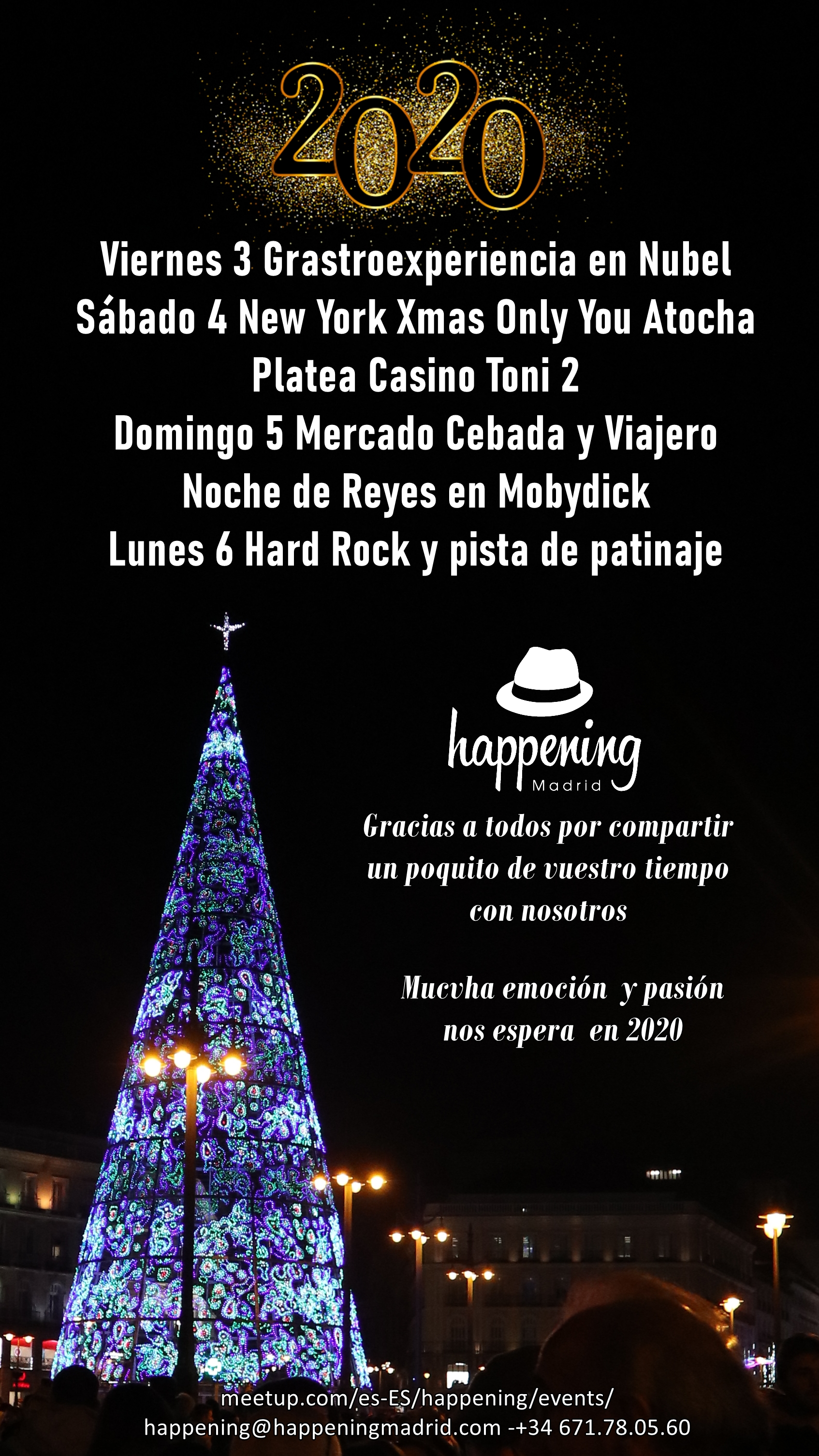 Y nada más, queridos amig@s, desearos que este año que comienza esté lleno de alegría, pasión y magníficos encuentros. Nosotros, desde Happening Madrid, haremos todo lo posible para que así sea.