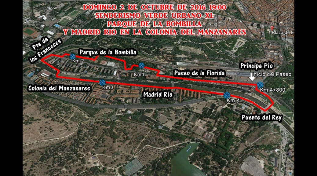 En el Parque de la Bombilla iremos por el Paseo de la Senda del Rey hasta llegar a las ermitas gemelas de San Antonio de La Florida, de aquí llegaremos hasta el Puente de la Reina Victoria y bajaremos por Madrid Rio hasta llegar a Príncipe Pío.